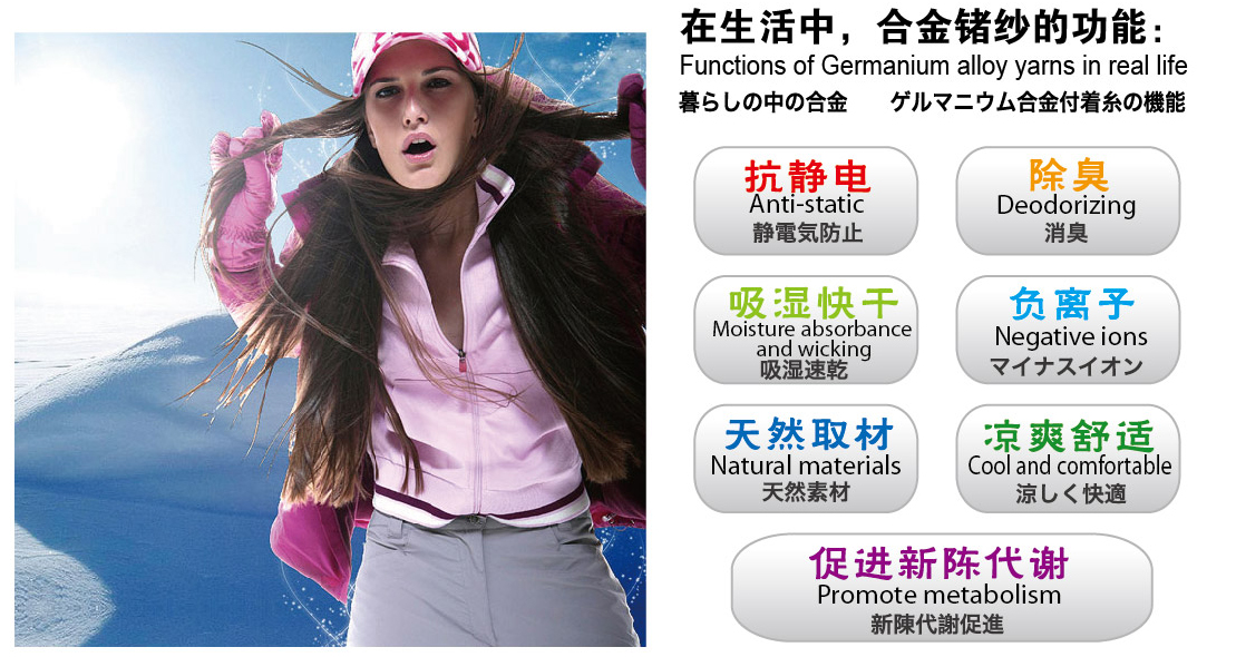 合金鍺一直是日本風(fēng)行的保健產(chǎn)品,具有負(fù)離子、遠(yuǎn)紅外線、促進(jìn)血液循環(huán)等功效,已經(jīng)于市場(chǎng)上被大量運(yùn)用制成手環(huán)、項(xiàng)圈等兼具保健與美觀的商品,而本公司的合金鍺也具有上述功能。本公司經(jīng)高溫表面改質(zhì)的合金鍺,具有強(qiáng)力的吸附效果,可吸附臭味、水氣,讓合金鍺紗發(fā)揮更舒適的效果。