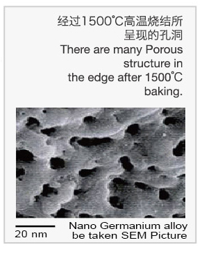 先將鍺石研磨成微米級(jí)微粉(約?5μm)然后置入高溫1500℃燒結(jié),將鍺石內(nèi)的其他雜質(zhì)灰化,鍺以外的其他離質(zhì)在熔點(diǎn)都比鍺低。燒結(jié)后的鍺石粉體上將會(huì)出現(xiàn)無數(shù)孔洞,鍺粉經(jīng)過二次研磨成納米大小,使得孔洞的暴露面積增大,讓其吸咐能力變強(qiáng)。